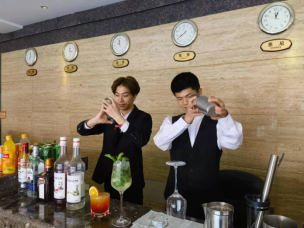 酒店管理教研室在躬行楼一楼大厅设置了4个特色展台,向前来参观的师生展示了调酒服务、口布折花、主题客房布草创意折叠以及主题客房夜床设计。