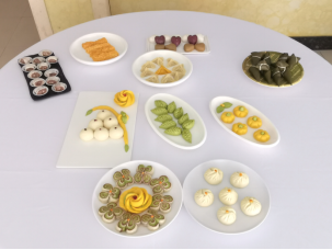 烹饪专业教研室则在躬行楼一楼实训室设置了厨艺作品展台,从贵州特色美食出发,到造型独特、可赏可品的创意面点,吸引大量师生驻足欣赏,此外烹饪专业教研室还将技能大赛获奖作品融入菜品设计,体现了职业教育的“以赛促学”、“以赛促教”。