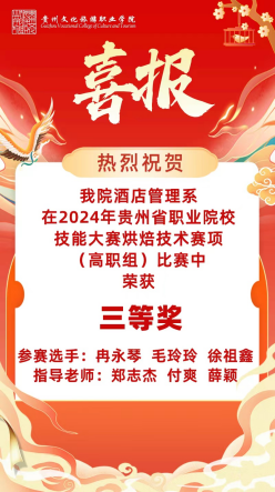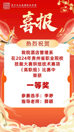 4月12日,2024年贵州省职业院校技能大赛(高职组)烘焙技术赛项在贵州食品工程职业学院举行,我院学子2022级中西面点工艺2班李渺、毛玲玲、冉永琴,2023级中西面点工艺3班徐祖鑫,2023级中西面点工艺1班王光慧代表学院参赛,酒店管理烹饪教研室薛颖、郑志杰、付爽任指导教师。