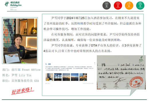 实习是我院人才培养过程的重要环节,是提高学生职业技能和职业素养的重要途径。在2022级学生实习中酒店管理系涌现了大批优秀实习生,他们在工作中始终以积极求知的心态认真工作,展现出了良好的适应能力和工作风貌。