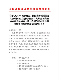 2026年(新加坡)国际商务活动策划大赛中国地区选拔赛暨第十九届全国高校商业精英挑战赛文旅与会展创新创业实践竞赛全国总决赛已于2025年11月8日圆满落下帷幕。经过大赛评审委员会评审,我院酒店管理系2024级会展策划与管理2班韦宝俊、周圆梦玲、张露露、潘绍芬、谭玉在总决赛中斩获全国二等奖,指导教师张澜可仪获最佳指导教师奖。