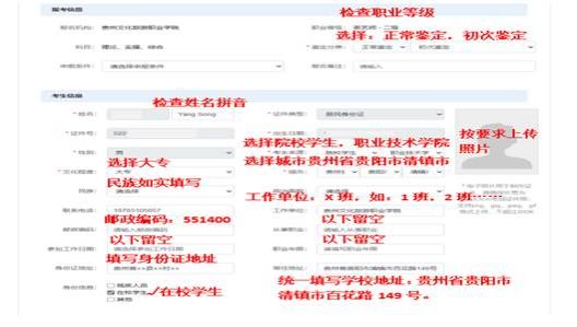 1.学生登陆网上报名平台(https://gzwhly-jndj-ks.zjyun.org ),注册用户,登录选择“贵州贵阳”和报考职业,按页面提示进行网上报名,操作详见手册(附件1),填写要求如下: