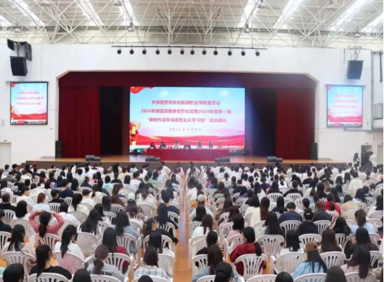 学院团委副书记杨淼宣布了《共青团贵州文化旅游职业学院委员会关于同意杨艳玲、杨勇、严先艳、孙兰芳等141名同学发展为新团员的决定》,随后新团员代表上台佩戴团徽,新团员代表讲话,在团旗下进行入团宣誓仪式。