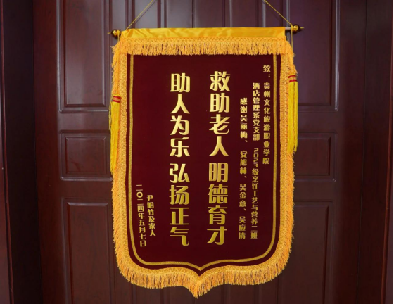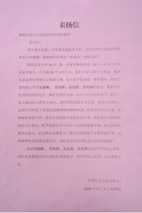 5月9日,市民尹女士眼含泪水将印有“救助老人明德育才,助人为乐弘扬正气”的锦旗和感谢信送到我院,诚挚感谢我院酒店管理系23级烹饪工艺与营养专业2班吴丽梅、安旭林、吴金意、吴应清4名同学勇救失联痴呆老人。