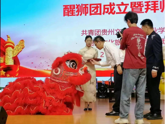 为进一步学习贯彻党的二十大精神,坚定文化自信,传承发扬中华优秀传统文化,在学院党委的坚强领导下,学院团委在学生社团的基础上正式成立了“醒狮团”,5月29日,在体育馆隆重举行了学生社团“醒狮团”成立暨拜师仪式。学院党委书记陆勇昌,学院团委书记刘贤雨,学院团委干事、学生社团总负责孙敬尧,学院武术协会负责人、醒狮团发起人唐宇,以及贵州黔麟堂龙狮团班子成员出席活动。活动在庄重的国歌声中拉开帷幕,陆勇昌作讲话,他指出:舞狮,作为一种源远流长的传统文化,不仅是一种娱乐活动,更是中华民族精神的重要体现,它象征着力量与勇气,承载着人们对美好生活的向往和追求。今天聚集在这里,不仅是为了庆祝学院“醒狮团”的成立,更是为了传承和弘扬这一优秀的传统文化,通过学习舞狮,我们可以增进友谊、了解历史文化,共同促进传统文化的继承与全面发展。