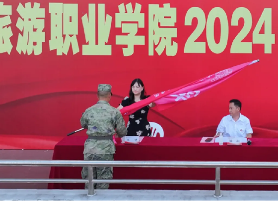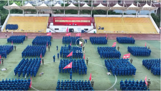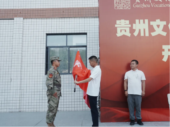 军训营指挥员集合整队,报告开训情况。学院党委委员、副院长李倩,党委委员、纪委书记郑亚威在清镇校区和南校区分别为贵州文化旅游职业学院2024级学生军训团授旗。