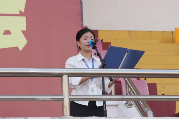 新生代表发言,她说:“不负韶华,不负青春。让我们挥别盛夏,喜迎金秋,用青春诠释我们的誓言,在未来三年,不怕苦、不畏难、敢奋斗,以优秀的学长学姐为榜样,牢记学校领导、老师和父母的殷切期望,脚踏实地,努力学习,珍惜时间,用智慧和青春书写新的人生篇章。”