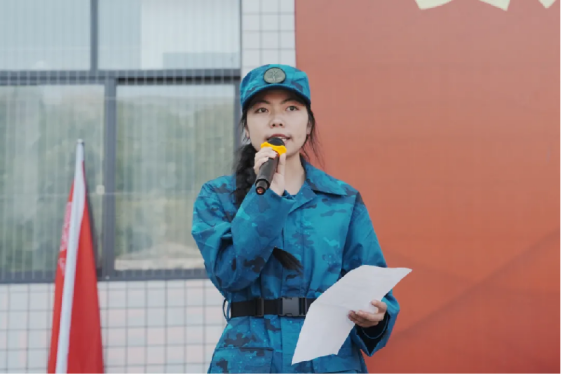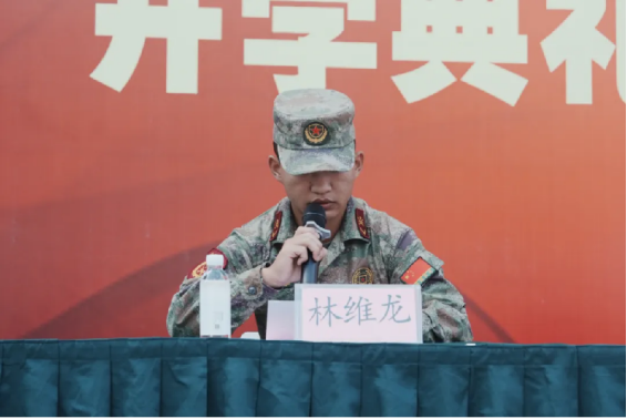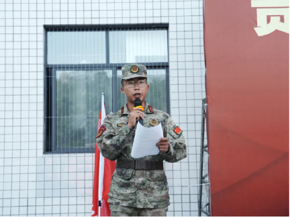 军训教官代表发言,表示很荣幸也很高兴能够承训此次军训任务,并代表全体教官向学校及受训同学做以下几点承诺:一、严格施训;二、文明施训;三、科学施训。希望全体同学能和教官、辅导员一起,充分发扬吃苦耐劳的优良品质,服从命令、听从指挥,齐心协力圆满完成本次军事训练。
