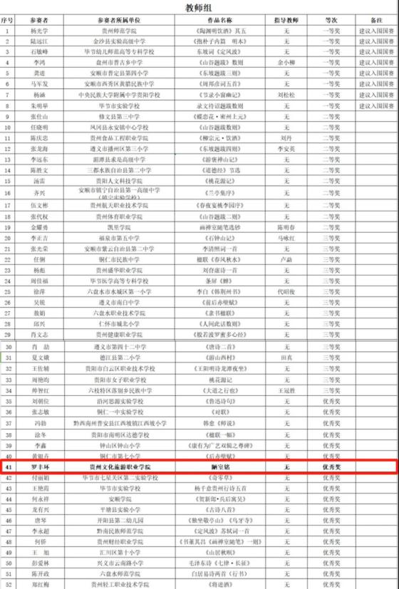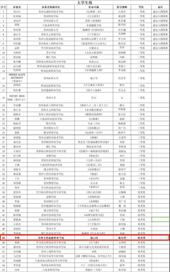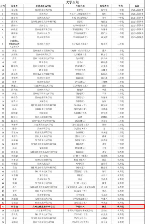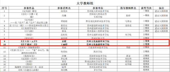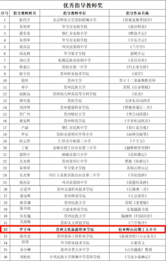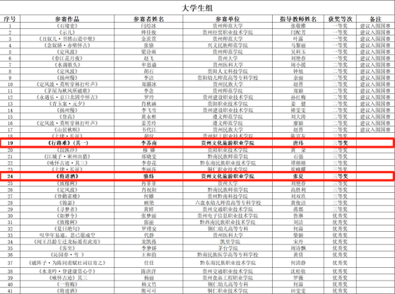 7月8日,贵州省教育厅对第六届中华经典诵写讲大赛“笔墨中国”汉字书写大赛贵州赛区复赛、“诗教中国”诗词讲解大赛贵州赛区复赛拟获奖项目进行了公示,我院共8支队伍获奖,其中一等奖1个,三等奖4个,优秀奖3个,优秀指导教师奖1个。