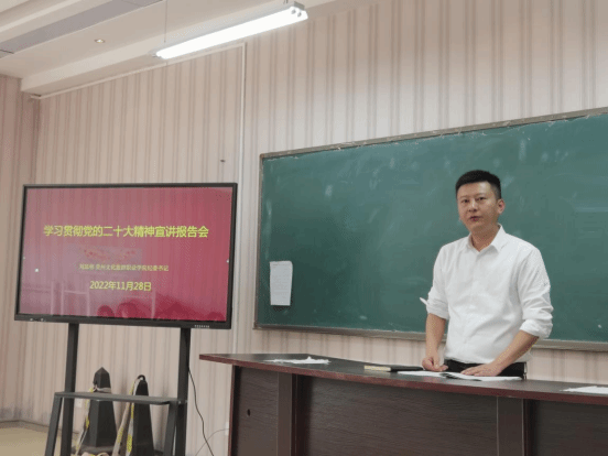 为深入学习贯彻党的二十大会议精神和历次全会精神,根据省委、省直机关工委、省文化和旅游厅、学校党总支统一安排,为深入学习党的二十大会议精神,深刻认识领会党的二十大主题、主要成果,新时代10年的伟大变革,全面建设社会主义现代化国家的目标任务,坚持党的全面领导和全面从严治党,应对风险挑战,教育、科技、人才工作的战略部署等重要精神切实把学习成果转化到教育教学工作上,结合学院工作实际,2022年11月28日12:20,文化艺术系党支部组织进行了党的二十大精神宣讲,宣讲人为学院纪委书记刘延彬同志。