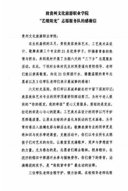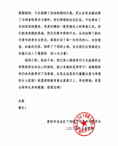 服务结束,但情感得到了连接,乌当区下坝村村委代表村民们写来了诚挚感谢信,6月9日的升旗仪式上,带队教师林罗楠宣读了感谢信。