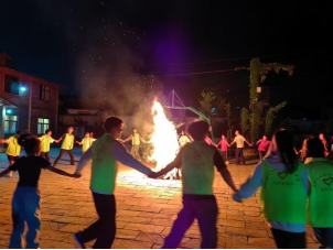(四)篝火晚会。当篝火被点燃,火星迸裂飞向天幕时,村民拉起志愿者的手围成圆圈,大家载歌载舞,尽情享受这一刻的美好。