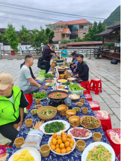 (三)长桌宴。暮色四合,长桌宴在坝子里摆开,山野时蔬鲜灵灵地堆叠在盘中,酸汤牛肉特有的辛香在空气里升腾,志愿者和乡亲们围坐在一起共享美食。