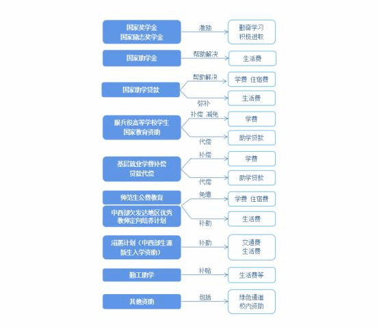 国家在高等教育本专科阶段建立起国家奖学金、国家励志奖学金、国家助学金、国家助学贷款等多种形式有机结合的高校学生资助政策体系。