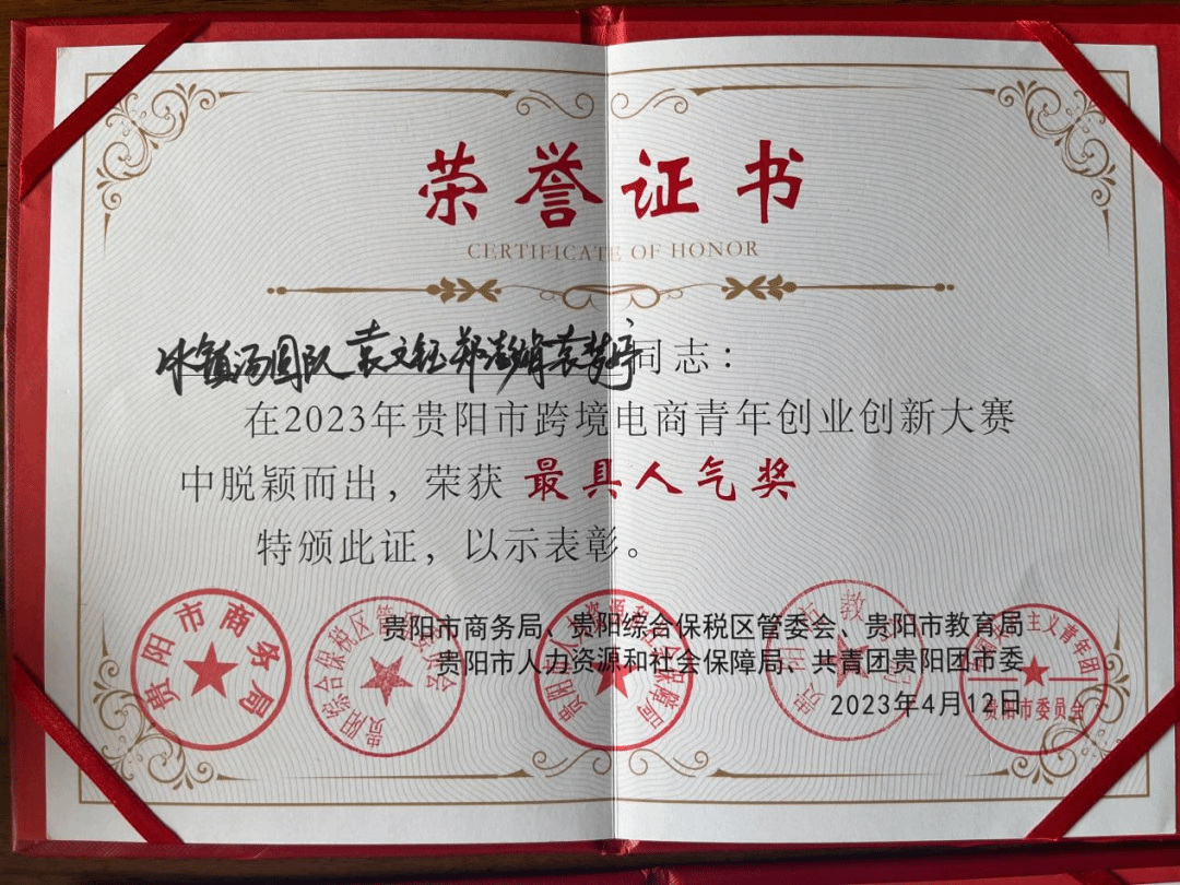 4月12日,由贵阳市商务局、贵阳市人社局、贵阳综合保税区管委会、贵阳市教育局主办的2023年贵阳市跨境电商青年创业创新大赛在观山湖区贵阳国际生态会议中心举行,我院信息教育系22级电子商务3班袁文钰、郑澎娟、袁梦婷首次参赛即不负众望,斩获最具人气奖。