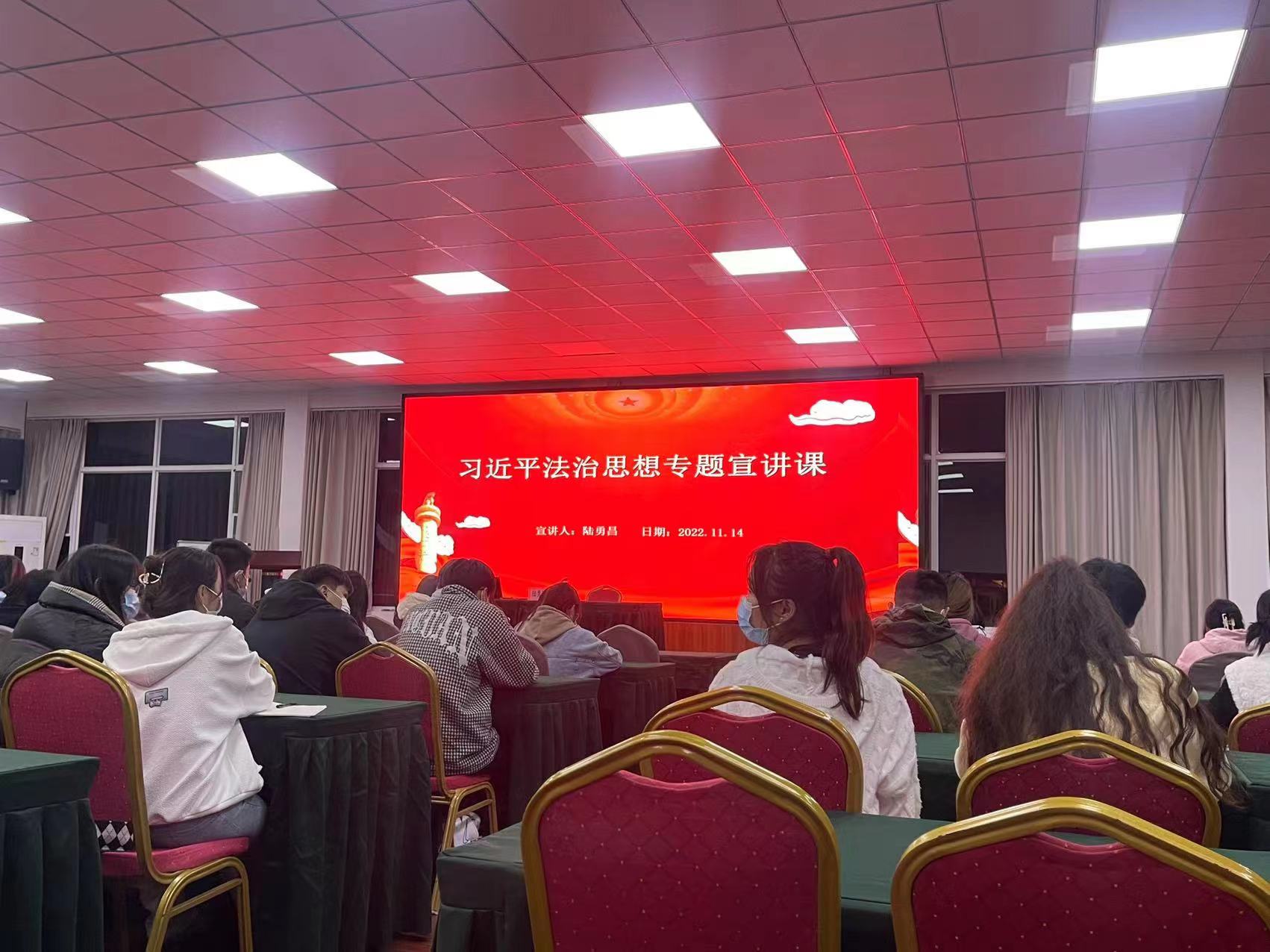 为进一步推动习近平法治思想宣传,2022年11月14日晚,学院组织各系学生在湖畔佳苑H204会议室开展习近平法治思想专题宣讲活动,主讲人:学院党委书记陆勇昌。