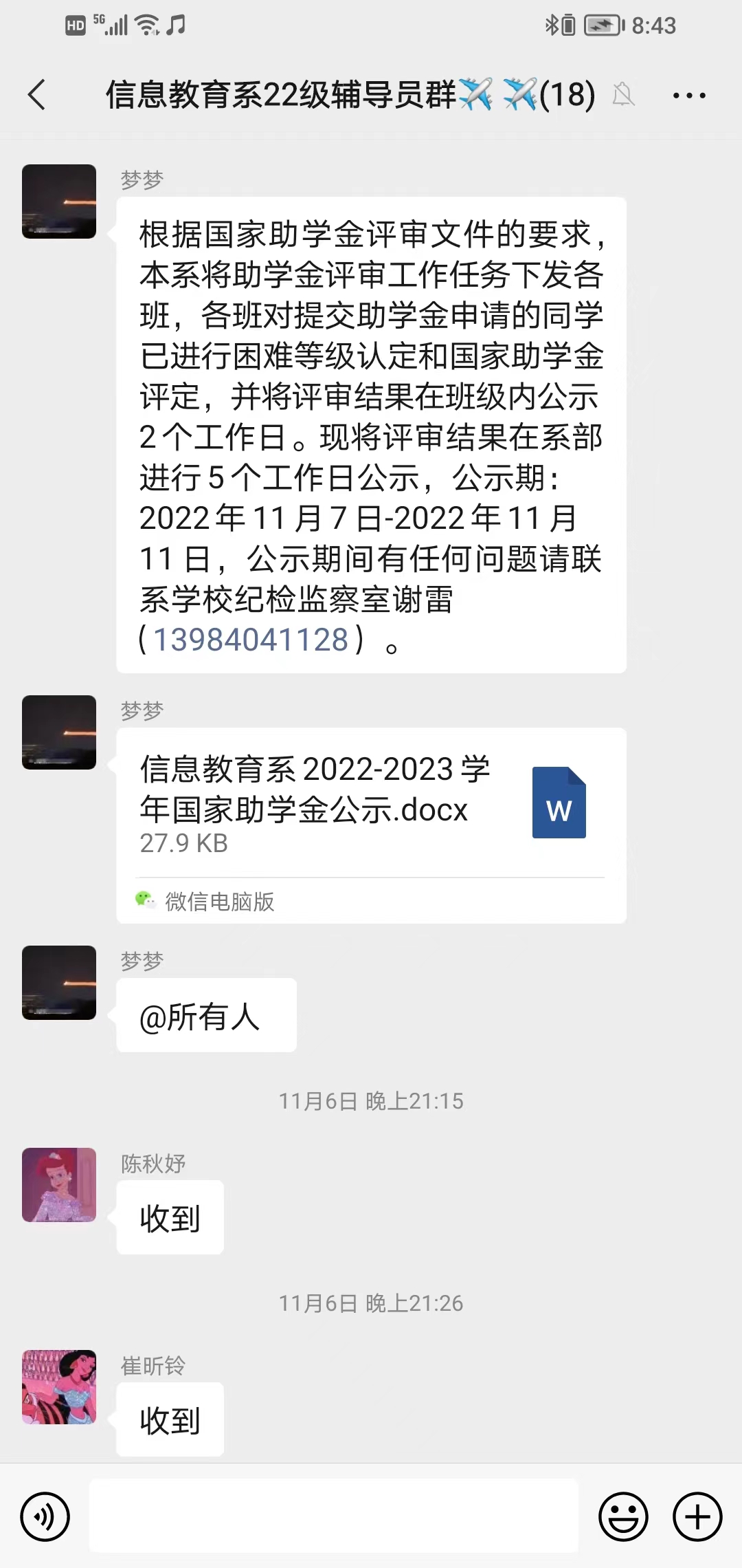 根据国家助学金评审文件的要求,本着公开公平公正原则,结合信息教育系实际情况,2022-2023学年高职生助学金评选结果第一阶段班级2个工作日的公示已完成,各班未收到学生异议反馈。现进行第二阶段2022年11月7日至2022年11月11日为期5个工作日的系部公示,并公开学院纪检监察室电话,畅通公示渠道。