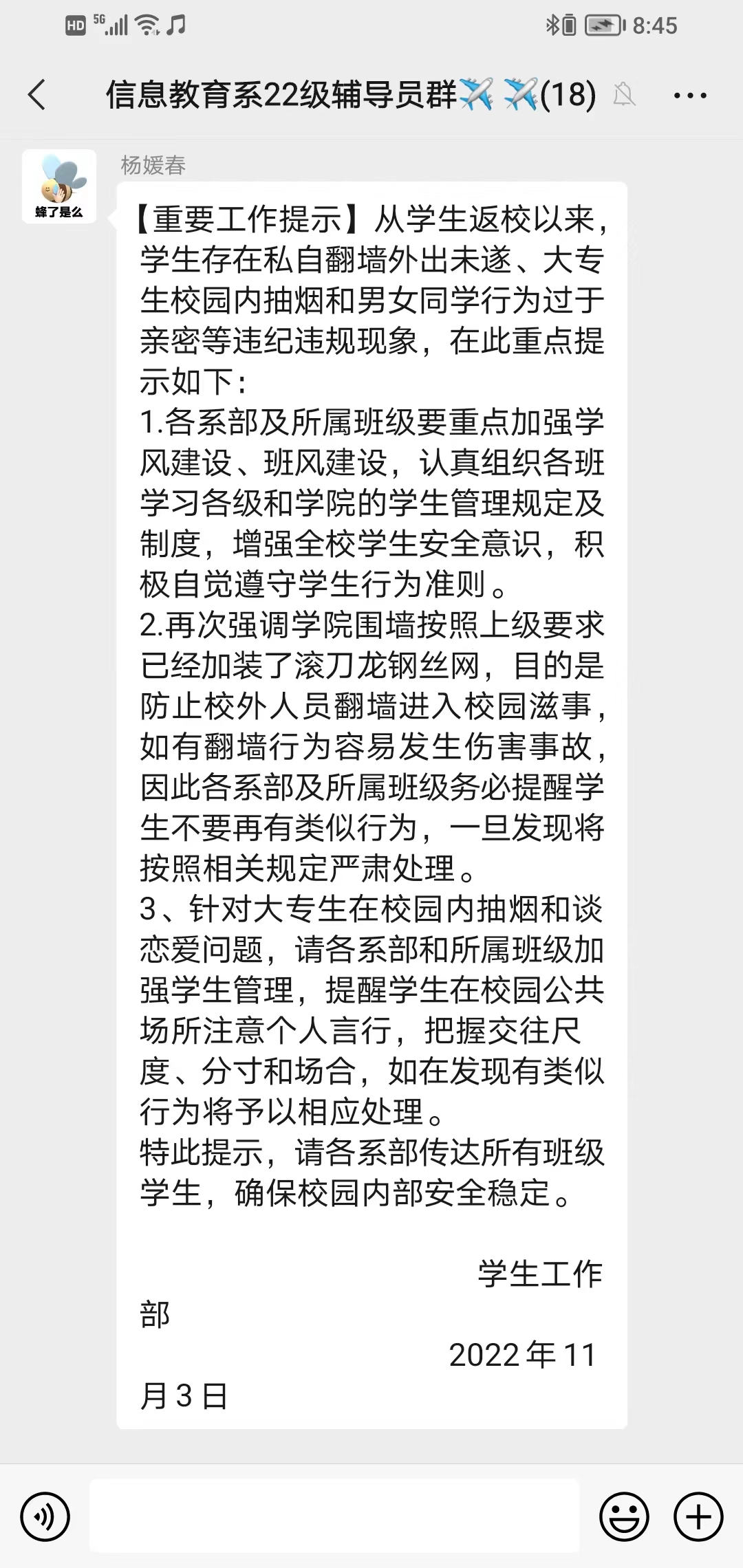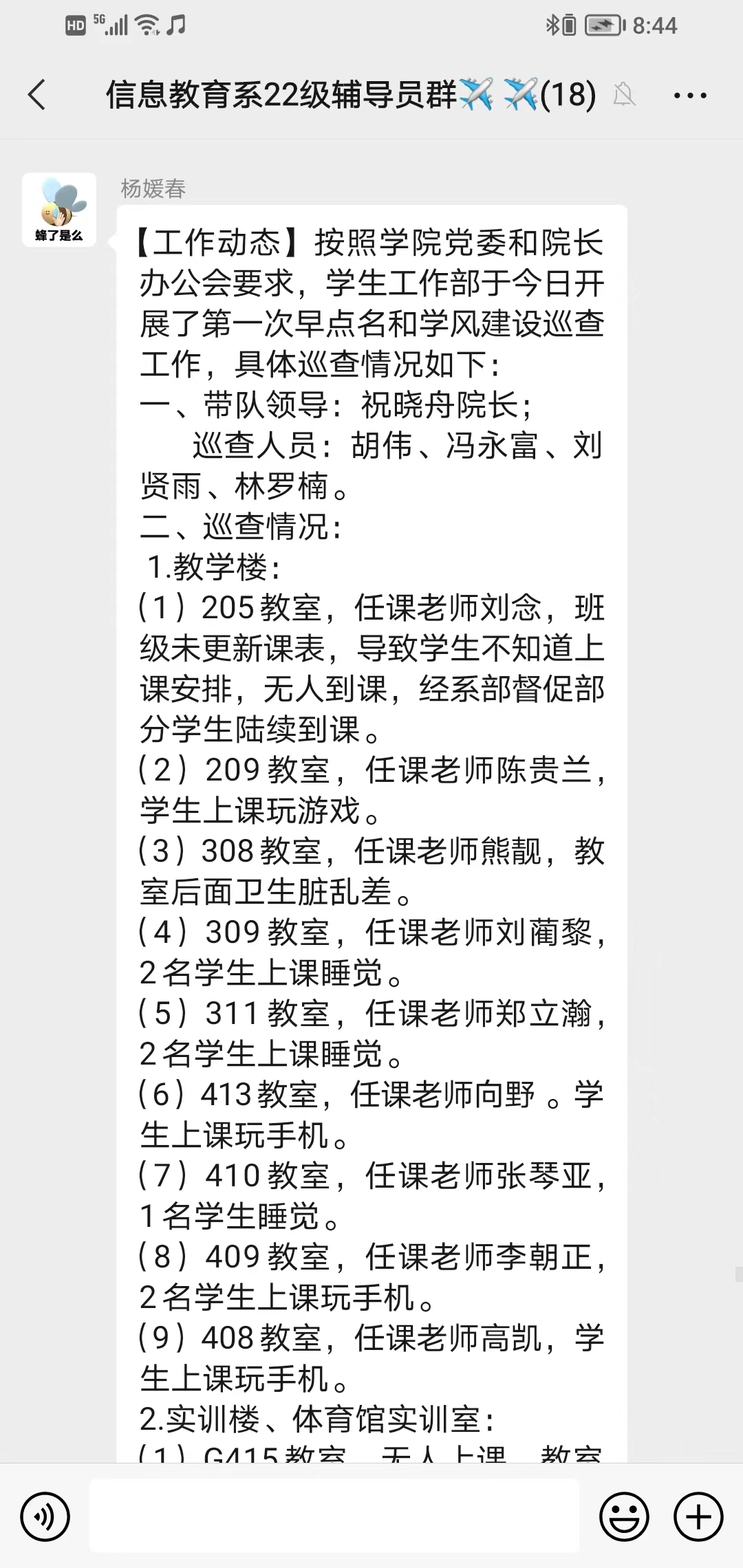为响应学院号召,信息教育系要求各班加强学风建设、班风建设,认真组织学生学习相关管理规定,遵守大学生行为准则。