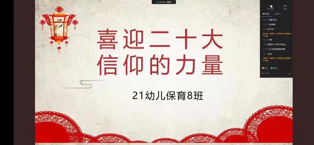 为迎接二十大的召开,信息教育系21级、22级36个班级共计1786人,各班在辅导员主持下采取钉钉直播方式,召开喜迎二十大主题班会。各班采取观看视频资料,诗歌朗诵,在线交流等方式开展了一场别开生面的主题班会。值此国庆佳节,党的20大即将召开之际,开展此次班会很有意义。师生相聚线上,交流思想,祝福祖国,感慨祖国母亲73周年来取得的伟大成就,增强民族自豪感与凝聚力。