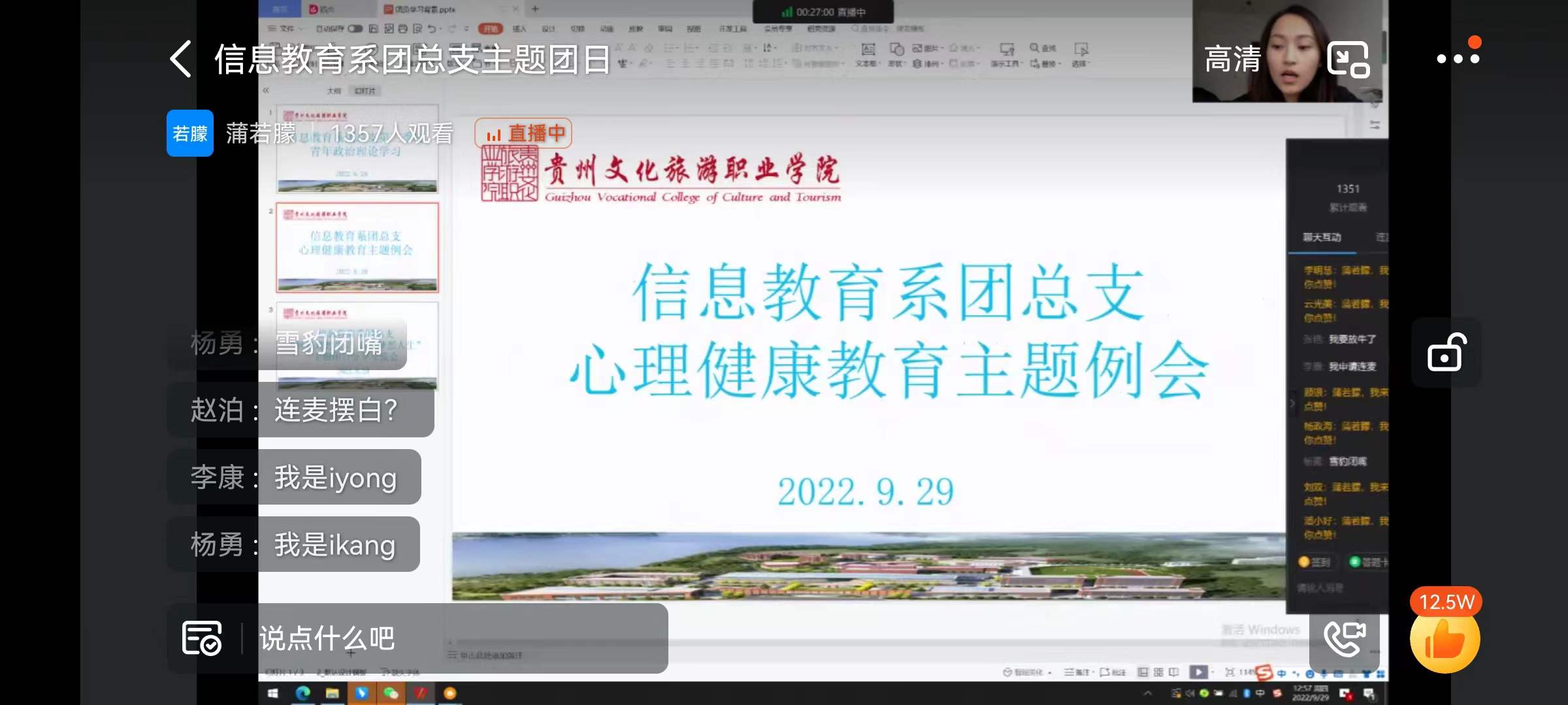 9月29日,信息教育系团总支组织召开心理健康教育例会。因疫情原因,本次会议以钉钉线上直播方式进行,会议由系团总支负责人蒲若朦主持,系团总支成员蒋朱萍、崔昕铃参加会议,21级、22级全体学生到会学习。会上,蒲若朦老师以《疫情期间,如何保持心理健康》主题开展了一堂心理健康教育课。由于居家的政策要求,活动空间受限、生活方式发生改变,很多同学可能会出现心理压力,她围绕保持生活作息规律、理性获取权威疫情咨询、保持稳定相互支持、保持健康人际互动等四个方面和大家分享了自我调适的方法。强调居家认真上网课的同时,要坚持每日按时钉钉打卡、健康打卡,也要一如既往地关注属地、学校的最新防控要求,积极配合属地、学校做好防控工作,不信谣、不传谣、勤消毒、不聚集。