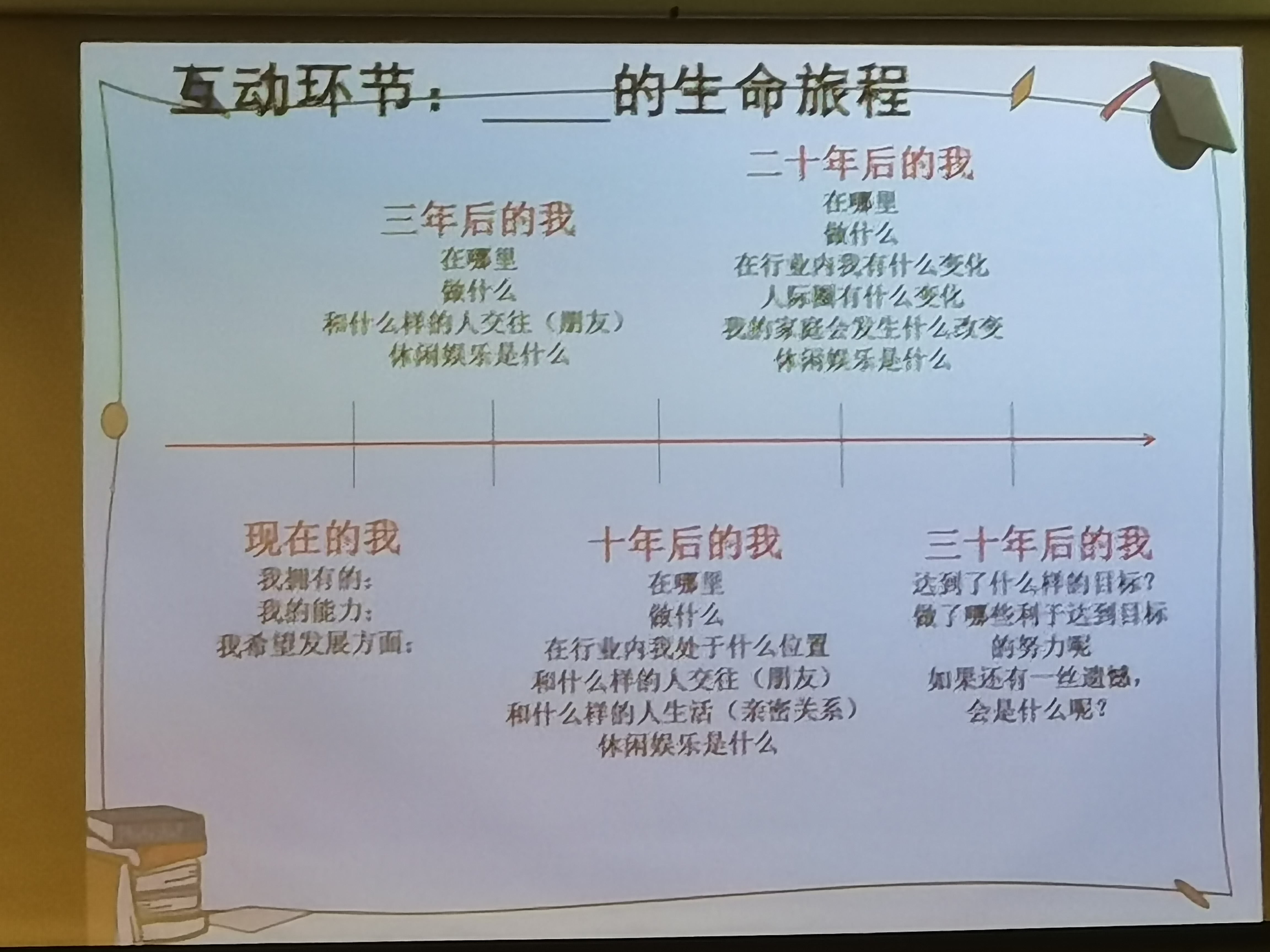 江激老师采用现场互动教学法,运用“游戏+案例+情景展示+现场互动”等多种模式,紧扣主题,让学生以“现在的我、三年后的我、十年后的我、二十年后的我、三十年后的我”为时间轴写下人生规划,以该种方式告知学生制定短期目标、做好长期人生规划,更加清晰的认知自我,实现人生理想。