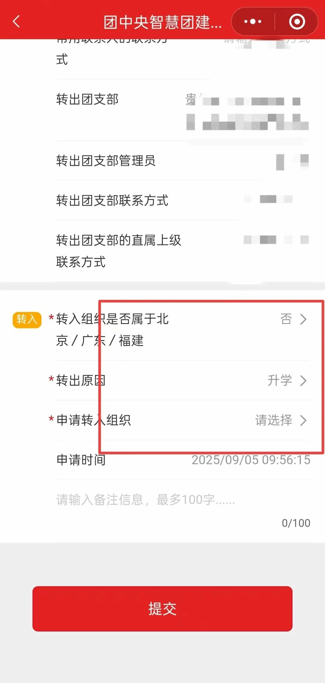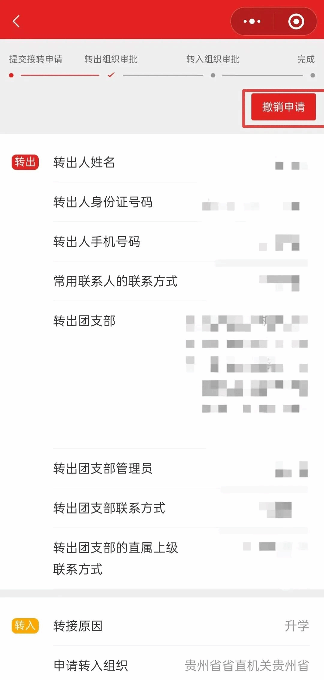 提交转接申请后 ,会经过一层层的审核:原来所在的团支部、该团支部的上级团组织 ,以及你申请转入的团支部都会对你填写的内容进行审核。所以如果发现转接申请未完成或滞留很久 ,请联系你的团支部负责人 ,让他们进行审核。 为了减少不必要麻烦 ,请同学们一定要如实正确填写去向,错填会被退回。