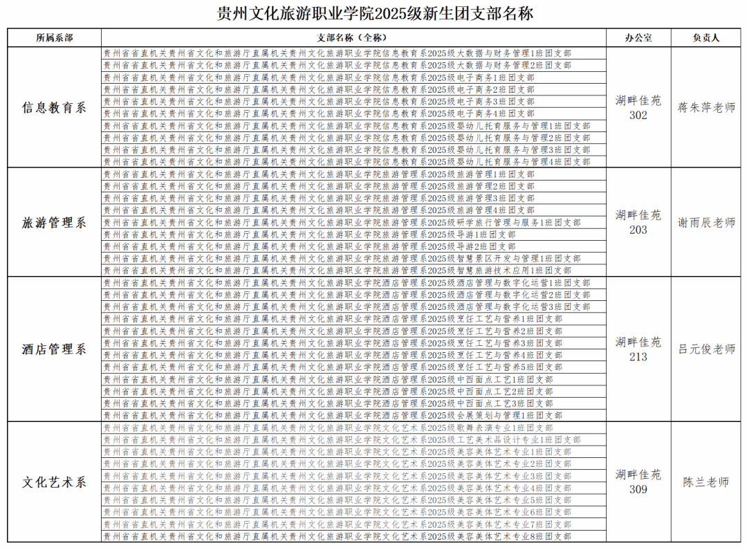转入团籍时一定要精确到 XX 系 XX 班级团支部例如:“贵州省省直机关贵州省文化和旅游厅直属机关贵州文化旅游职业学院酒店管理系 2025 级会展 1 班团支部”,未精确转到班级团支部的团员有可能会导致转接失败,请新生团员务必注意!(各班团支部名称如下图所示)
