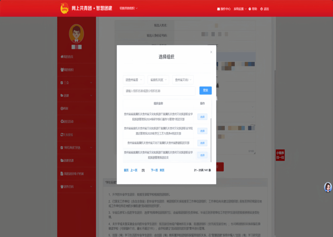 第二 ,查看选择的省份是否正确 ,选择转入系统团委组织时 ,要根据实际组织架构 ,选择所在组织体系 ,不能根据组织所在地选择具体省份 ,选择好省份后 ,无需选择市级、 县级组织 ,通过关键词搜索的方式可以进行查找 ,查找结果一般较多 ,建议多翻找几页;