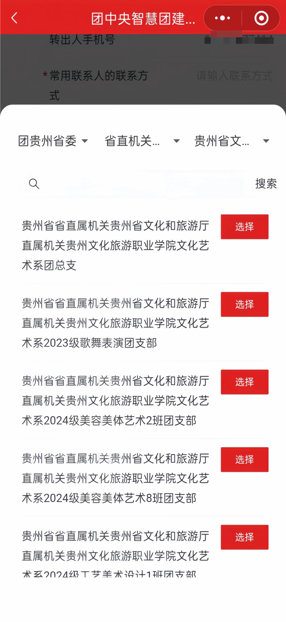 申请转入组织选择 “ 团贵州省委-省直属机关团工委 - 贵州省文化和旅游厅直属机关团工委-贵州文化旅游职业学院 xxxx 系 2025 级 xxx 班团支部”。