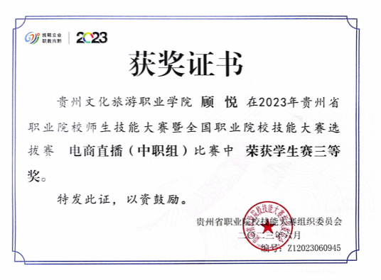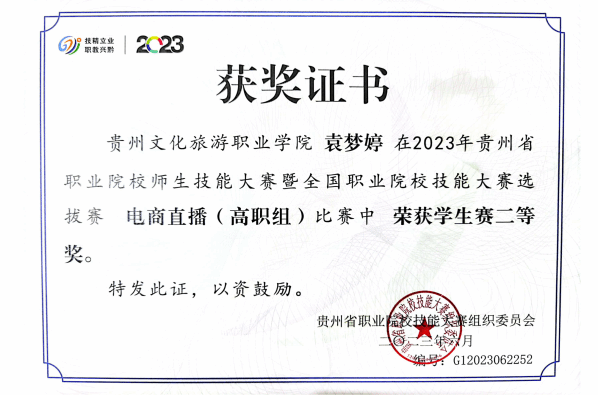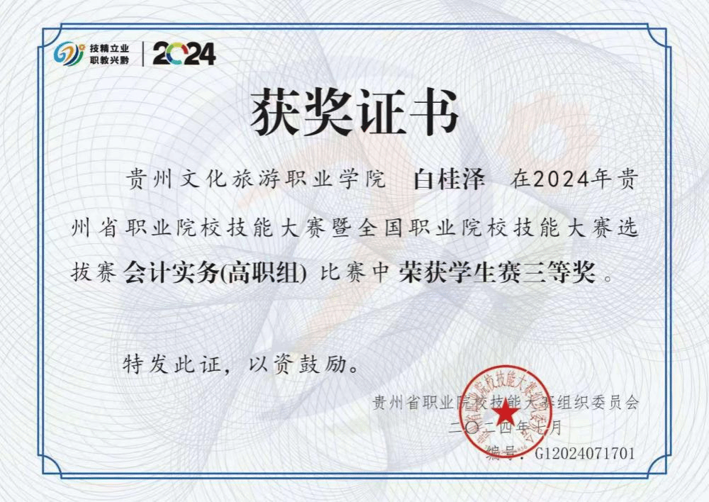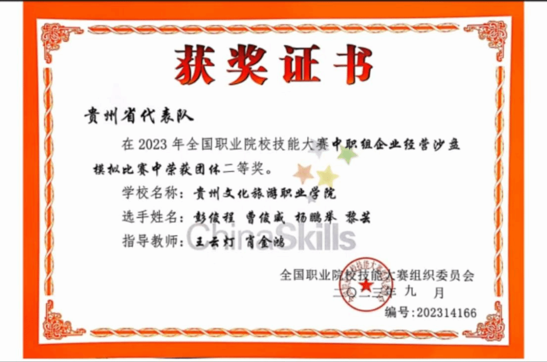 本专业注重学生实践操作技能培养,在近几年的全省职业院校技能比赛中获得多个奖项,2023年参加企业经营模拟赛项获得贵州省团体一等奖,并代表贵州省参加全国职业院校技能大赛比赛,并获得全国二等奖;2023年参加创新创业大赛获得贵州省团体三等奖;2024年参加企业经营模拟赛项再次获得贵州省团体一等奖;2024年参加会计实务赛项获得贵州省团体三等奖。2022年参加“一带一路”暨金砖国家技能发展与技术创新大赛数智财经赛项获得全国三等奖。