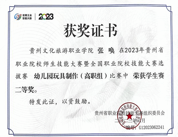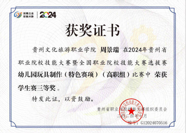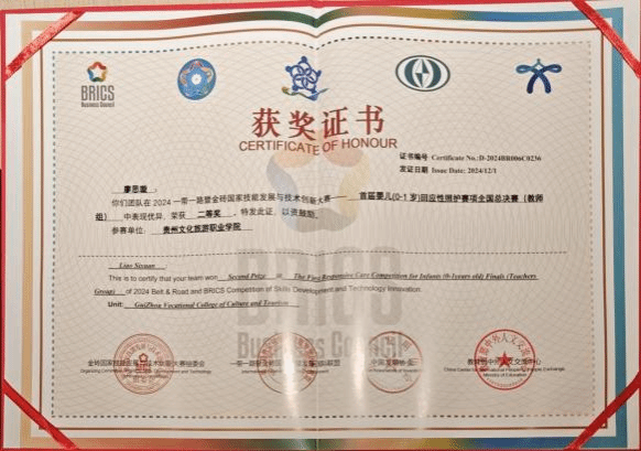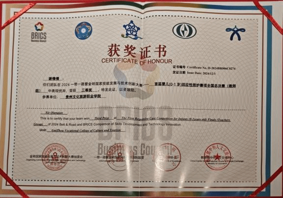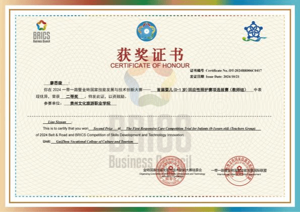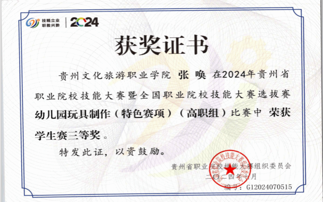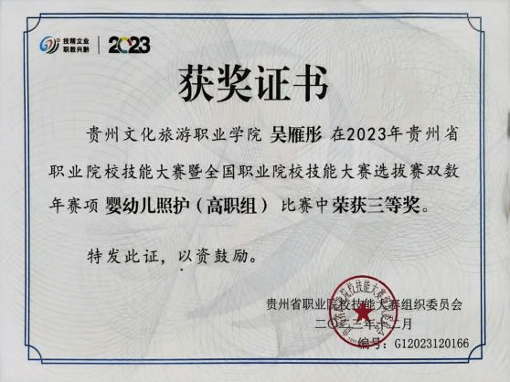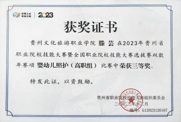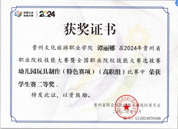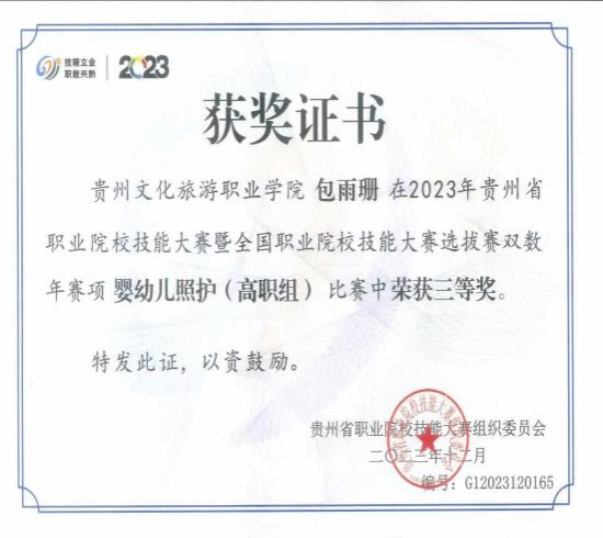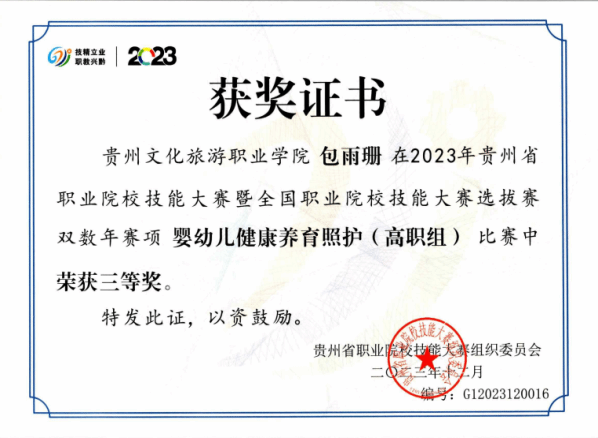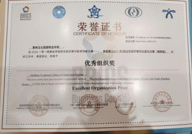 本专业注重学生实践操作技能培养,在近几年的全省职业院校技能大赛中获得多个奖项。学生参加2023年贵州省职业院校技能大赛暨全国职业院校技能大赛选拔赛“幼儿园玩具制作(特色赛项)”(高职组)二等奖、2023年贵州省职业院校技能大赛暨全国职业院校技能大赛选拔赛双数年赛项婴幼儿照护(高职组)三等奖、2023年贵州省职业院校技能大赛暨全国职业院校技能大赛选拔赛“健康管理”(高职组)三等奖、2024年贵州省职业院校技能大赛暨全国职业院校技能大赛选拔赛“幼儿园玩具制作(特色赛项)”(高职组)二等奖1项、三等奖2项,2024“一带一路”暨金砖国家技能发展与技术创新大赛首届婴儿(0-1岁)回应性照护赛项选拔赛(高校组)三等奖1项、优秀奖1项。