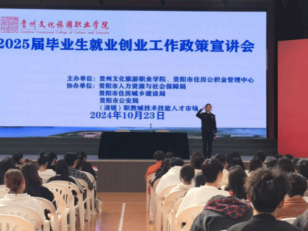 为深入学习贯彻习近平新时代中国特色社会主义思想和视察贵州重要讲话精神,发挥春晖行动的情感纽带作用,实施人才兴市战略,且更好地开展2025届毕业生就业创业工作,深入推进“筑人才·强省会”高校毕业生留筑行动,按照贵阳市委人才办统一部署,贵阳市住房公积金中心牵头,贵阳市人力资源和社会保障局、贵阳市住房和城乡建设局、贵阳市公安局、(清镇)职教城技术技能人才市场共同协作,于10月23日在贵州文化旅游职业学院体育馆举行了以“筑梦未来,留筑启航——秋季入学季就业创业指导讲座及政策宣讲专场活动”,帮助学生了解就业形势、掌握求职技巧、明确职业规划。我院2025届四系共计400余名学生参加了本次宣讲会。