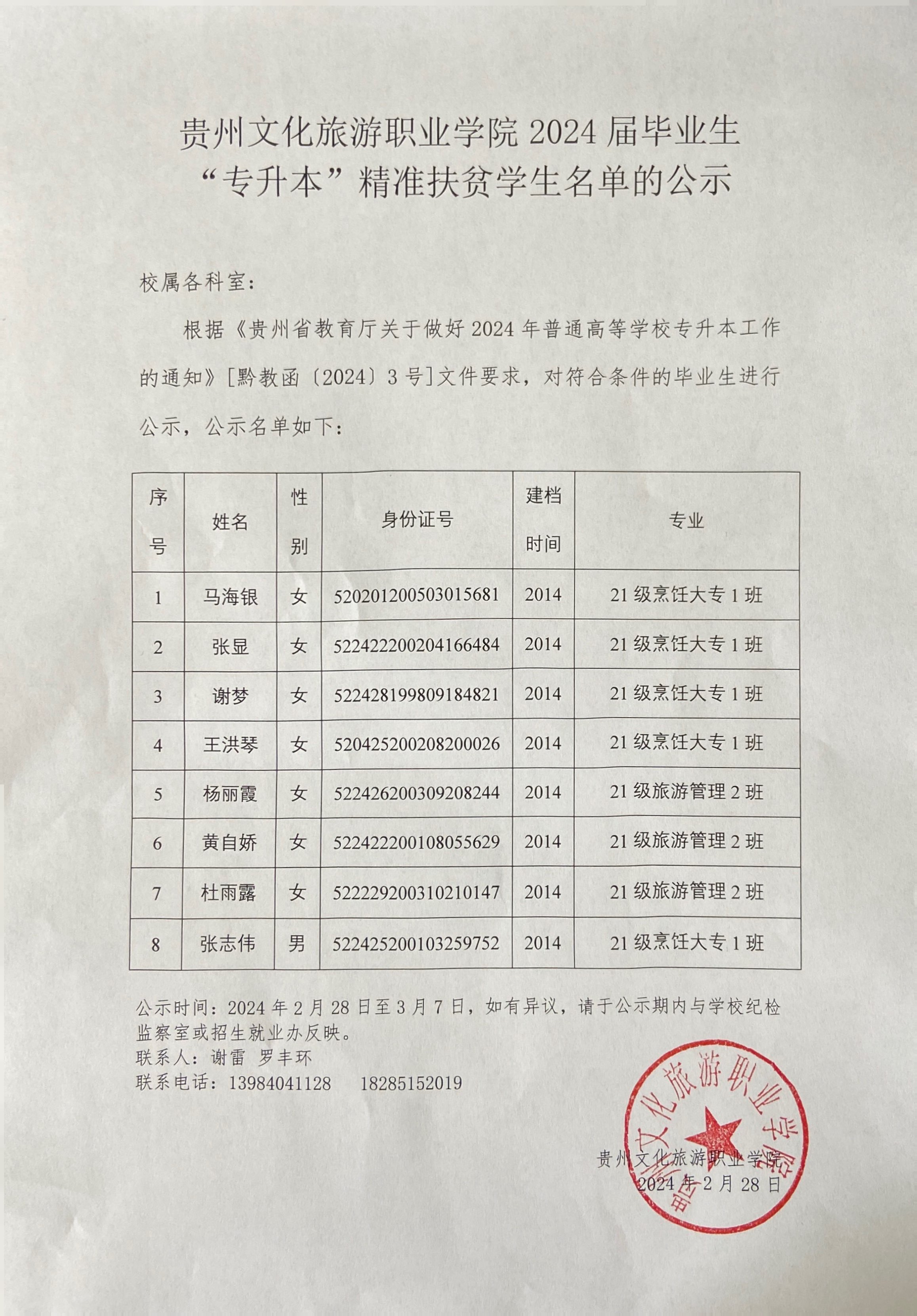 根据《贵州省教育厅关于做好2024年普通高等学校专升本工作的通知》[黔教函〔2024〕3号]文件要求,对符合条件的毕业生进行公示