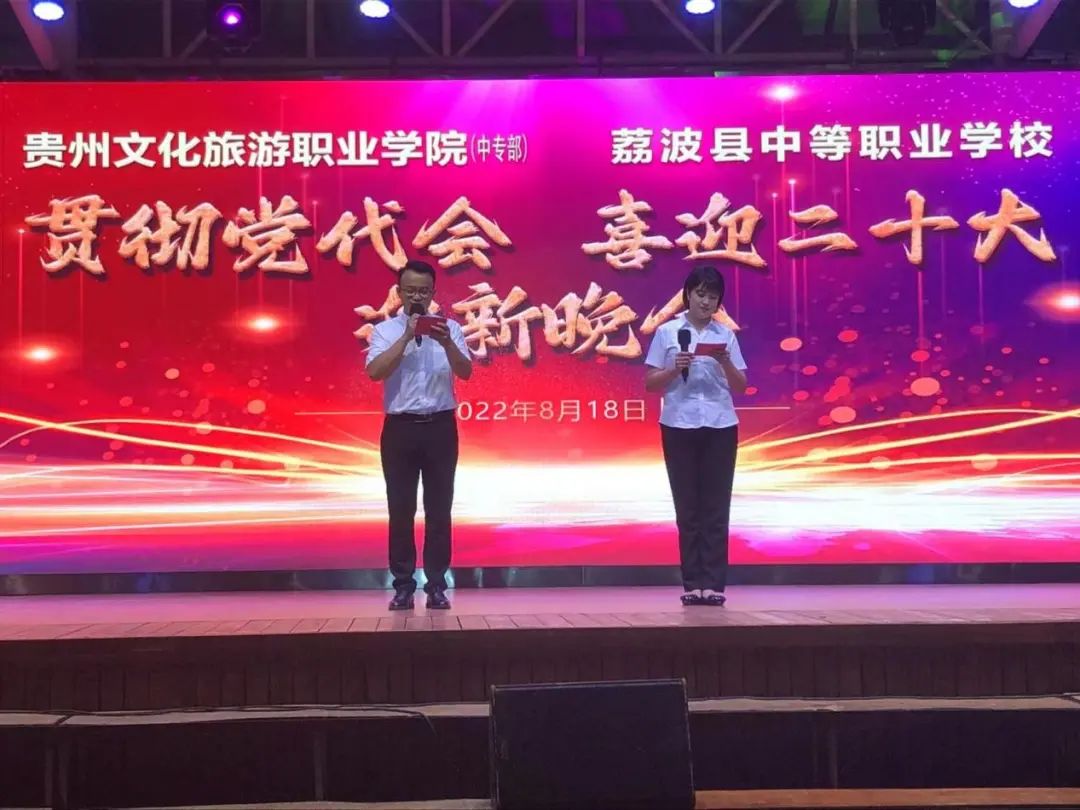 为迎接2022级新生的到来,展示职教风采,8月18日,学院(中专部)、荔波县中等职业学校举行“贯彻党代会喜迎二十大”迎新晚会。贵州文化旅游职业学院、荔波县中等职业学校师生同台演出,以精彩演出,表达对2022级新生的美好祝福。