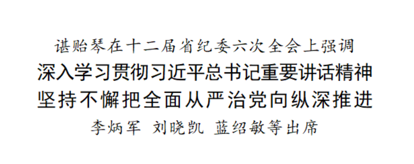 省委副书记、省长李炳军,省政协主席刘晓凯,省委副书记、省人大常委会副主任蓝绍敏,省委常委,省人大常委会、省政府、省政协领导班子成员和党组成员,省法院院长、省检察院检察长出席会议。省委常委、省纪委书记、省监委主任李元平主持会议并作工作报告。谌贻琴指出,习近平总书记在十九届中央纪委六次全会上的重要讲话,深刻总结新时代党的自我革命的成功实践,深刻阐述全面从严治党取得的历史性开创性成就、产生的全方位深层次影响,对坚持不懈把全面从严治党向纵深推进、迎接党的二十大胜利召开作出战略部署,立意高远、视野宏大、思想深邃、内涵丰富,具有很强的政治性、理论性、指导性、针对性,是推进新时代党的建设新的伟大工程的基本遵循,是指引我们纵深推进全面从严治党、以伟大自我革命引领伟大社会革命、走好新的赶考之路的纲领性文献。我们要学深悟透、知行合一,永远吹冲锋号,始终沿着总书记指引的方向奋勇前进。