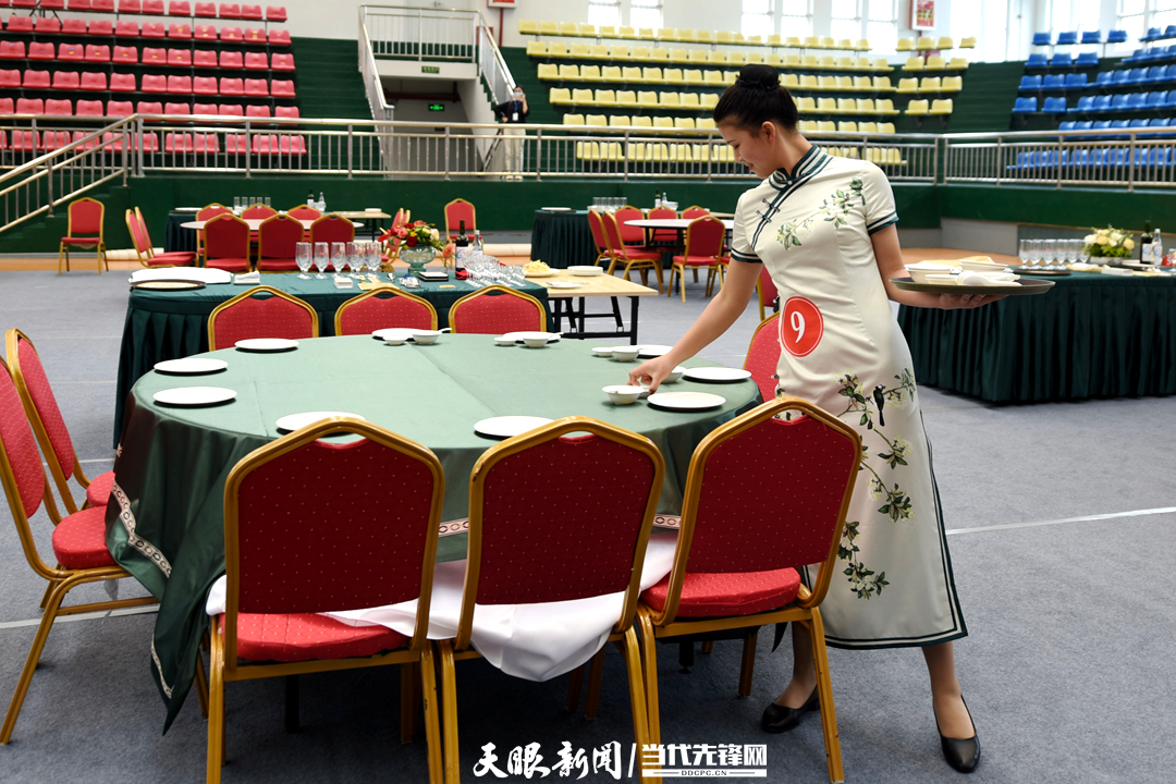 比赛现场,选手们分别围绕导游知识测试、导游词创作及讲解、导游服务才艺运用和酒店服务客房中式铺床与开夜床服务、酒店服务中餐宴会摆台等内容,认真完成动作要领,充分展示技能技巧。