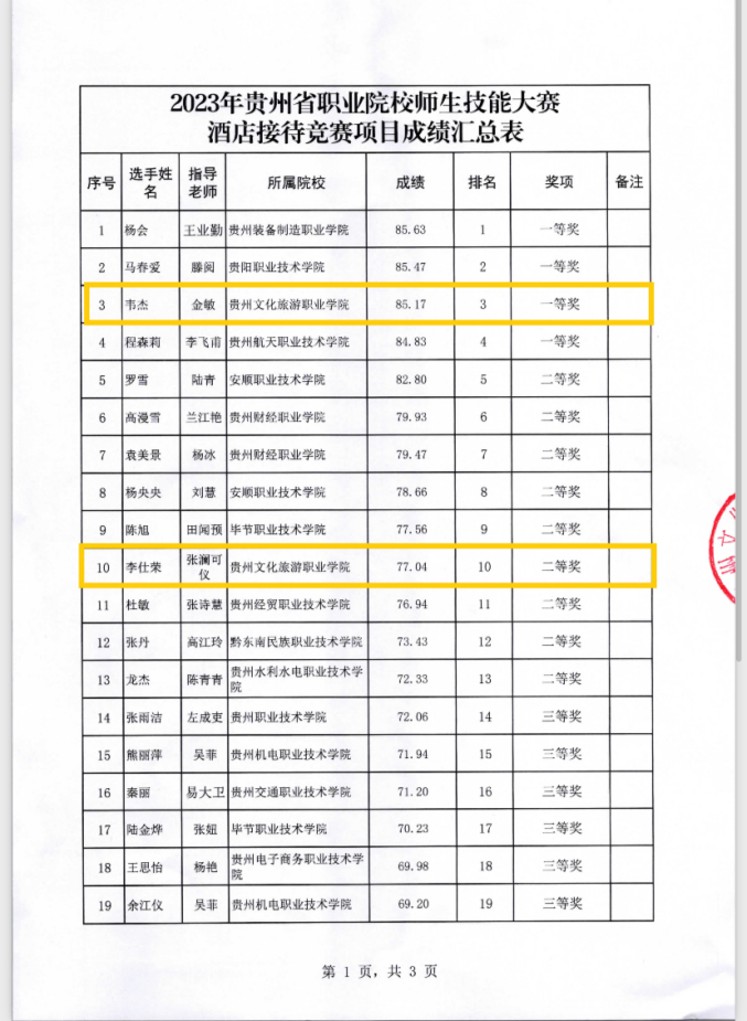4月12日至4月13日,2023年贵州省职业院校师生技能大赛(高职组)酒店接待赛项在贵州文化旅游职业学院举办。全省22所院校共44名参赛选手同台竞技,经过激烈角逐,我院旅游管理系2021级旅游管理2班韦杰荣获2023年贵州省职业院校师生技能大赛(高职组)酒店接待赛项一等奖,指导教师金敏;旅游管理系2022级酒店管理与数字化运营1班李仕荣荣获2023年贵州省职业院校师生技能大赛(高职组)酒店接待赛项二等奖,指导教师张澜可仪。