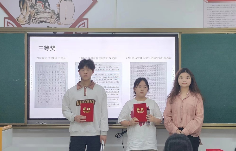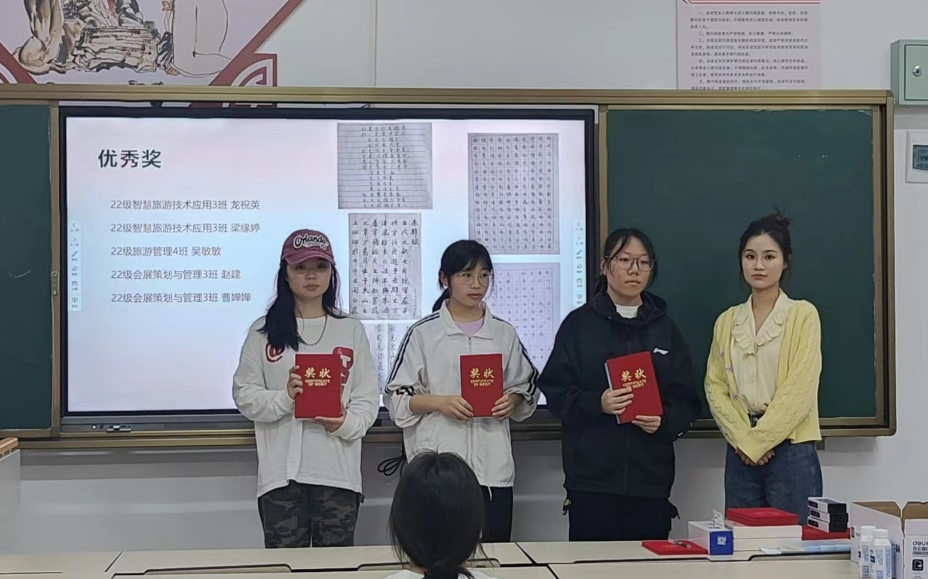 2023年4月13日,旅游管理系团总支在正行楼206教室举行颁奖典礼,对获奖同学颁发证书及奖品。