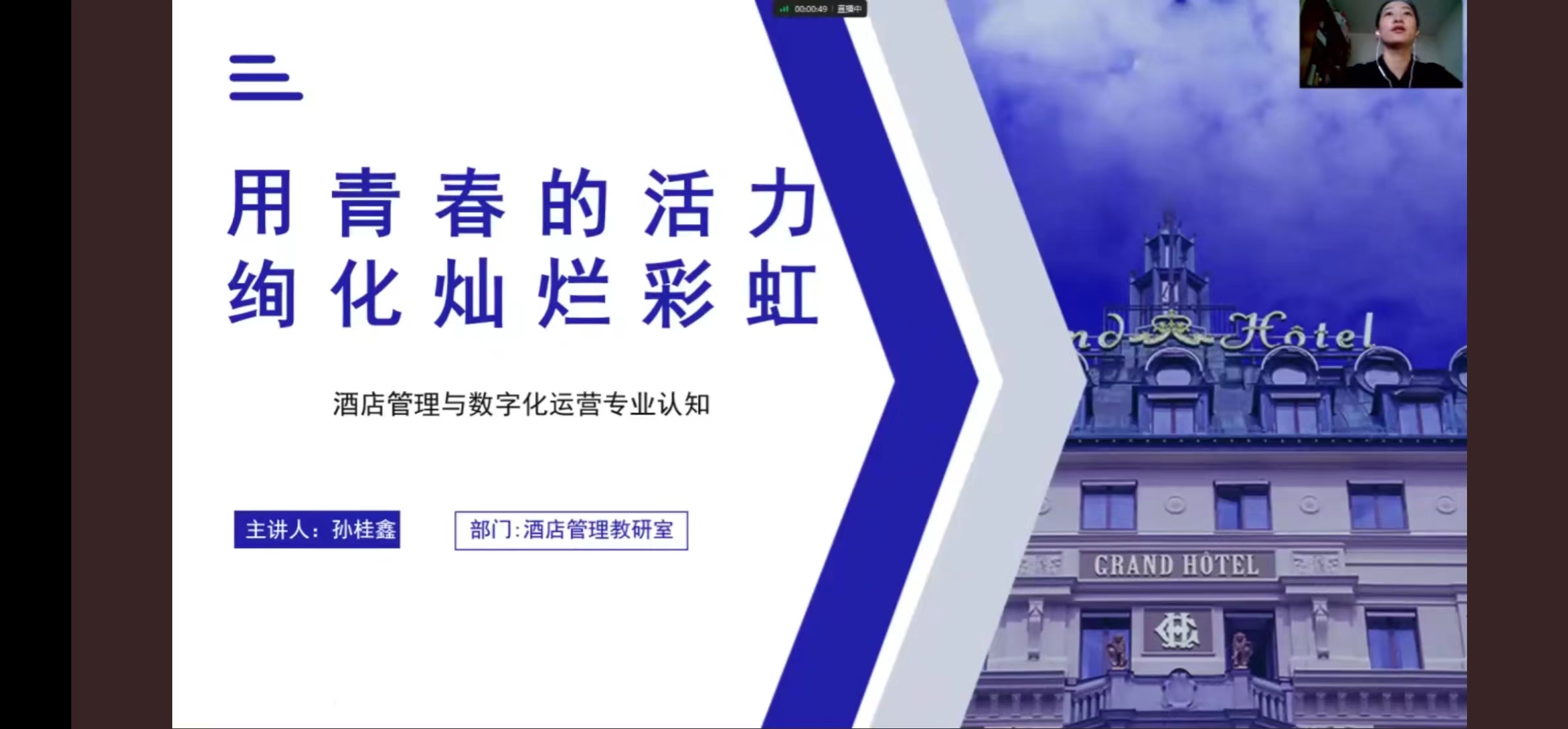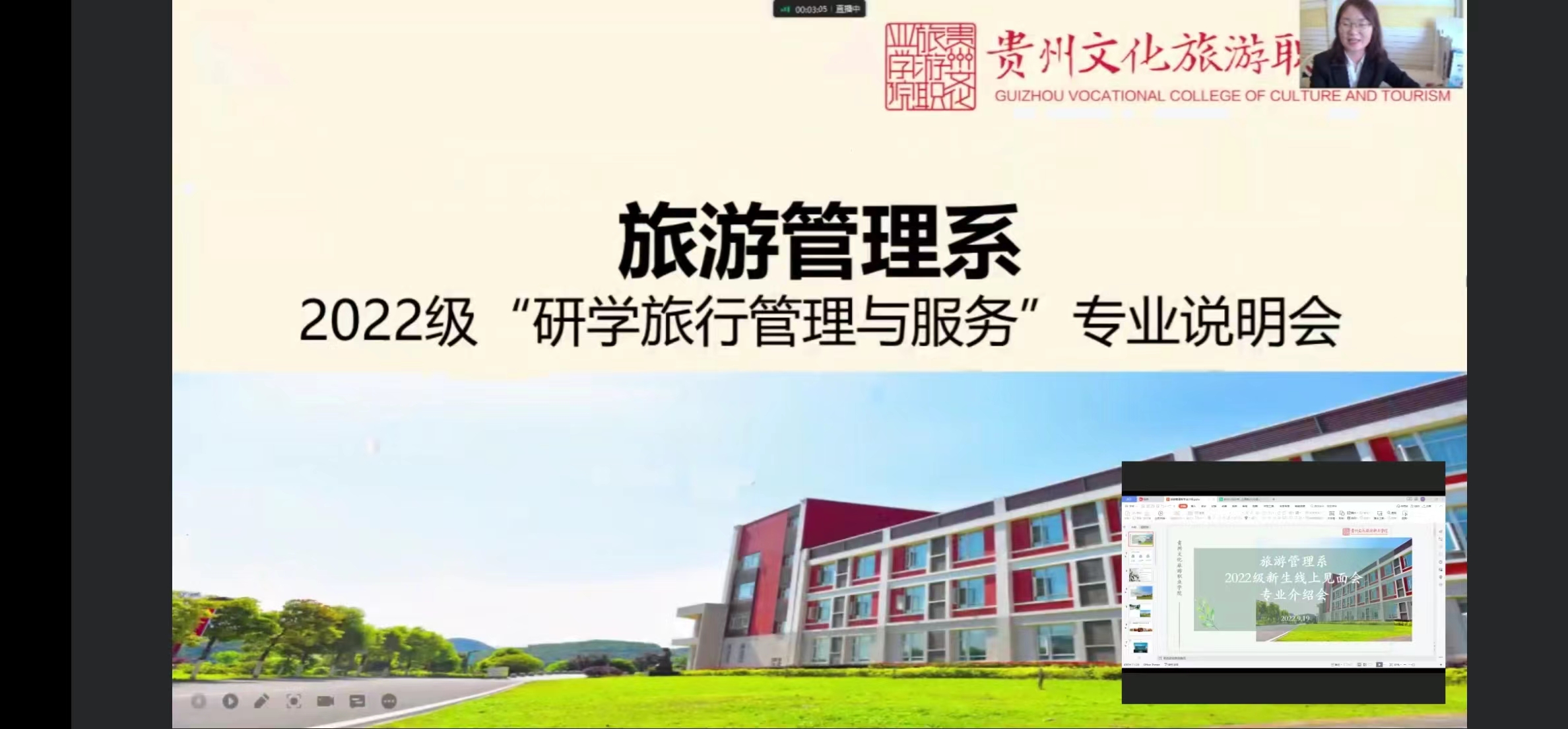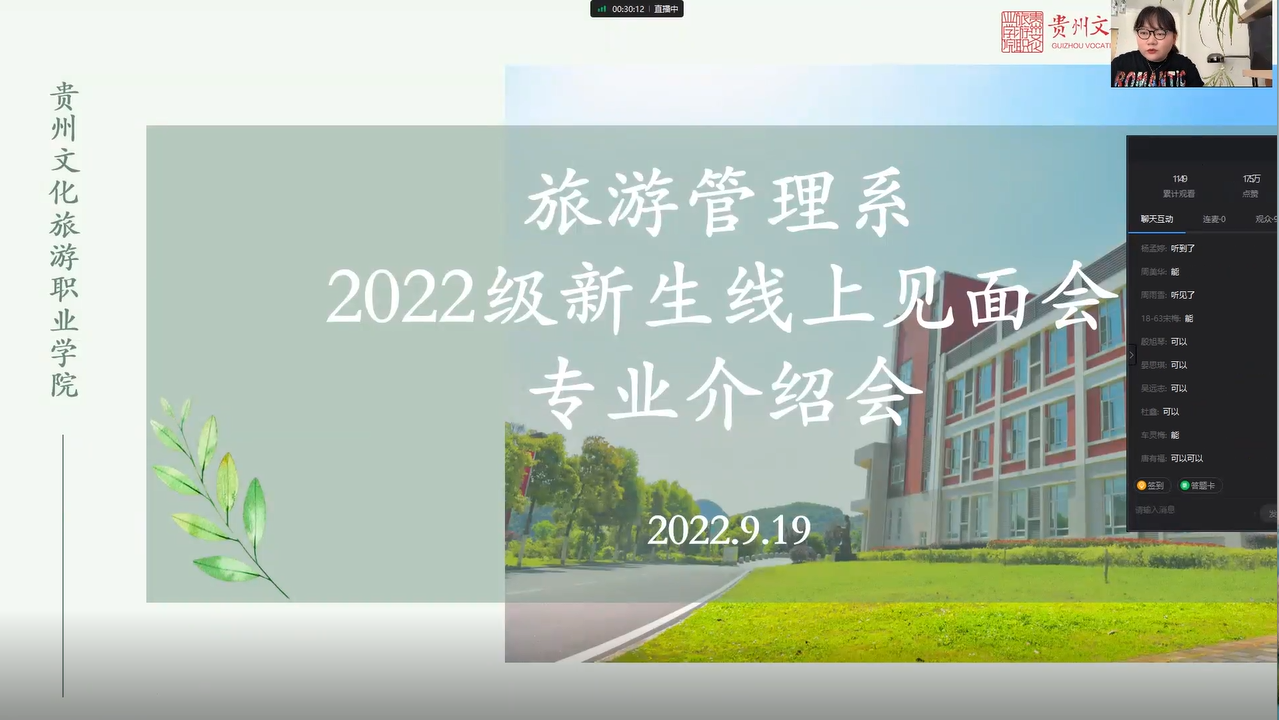 此次新生线上见面会、专业介绍会涵盖了本次旅游管理系所招8个专业,分别为旅游管理、研学旅行管理与服务、智慧景区开发与管理、智慧旅游技术应用、烹饪工艺与营养、中西面点工艺、会展策划与管理、酒店管理,每个专业由负责老师从专业职业面向、培养目标定位、专业能力要求、专业课程设置、职业技能等级证书、未来就业等方面进行了详细的介绍并回答新生所提问题。