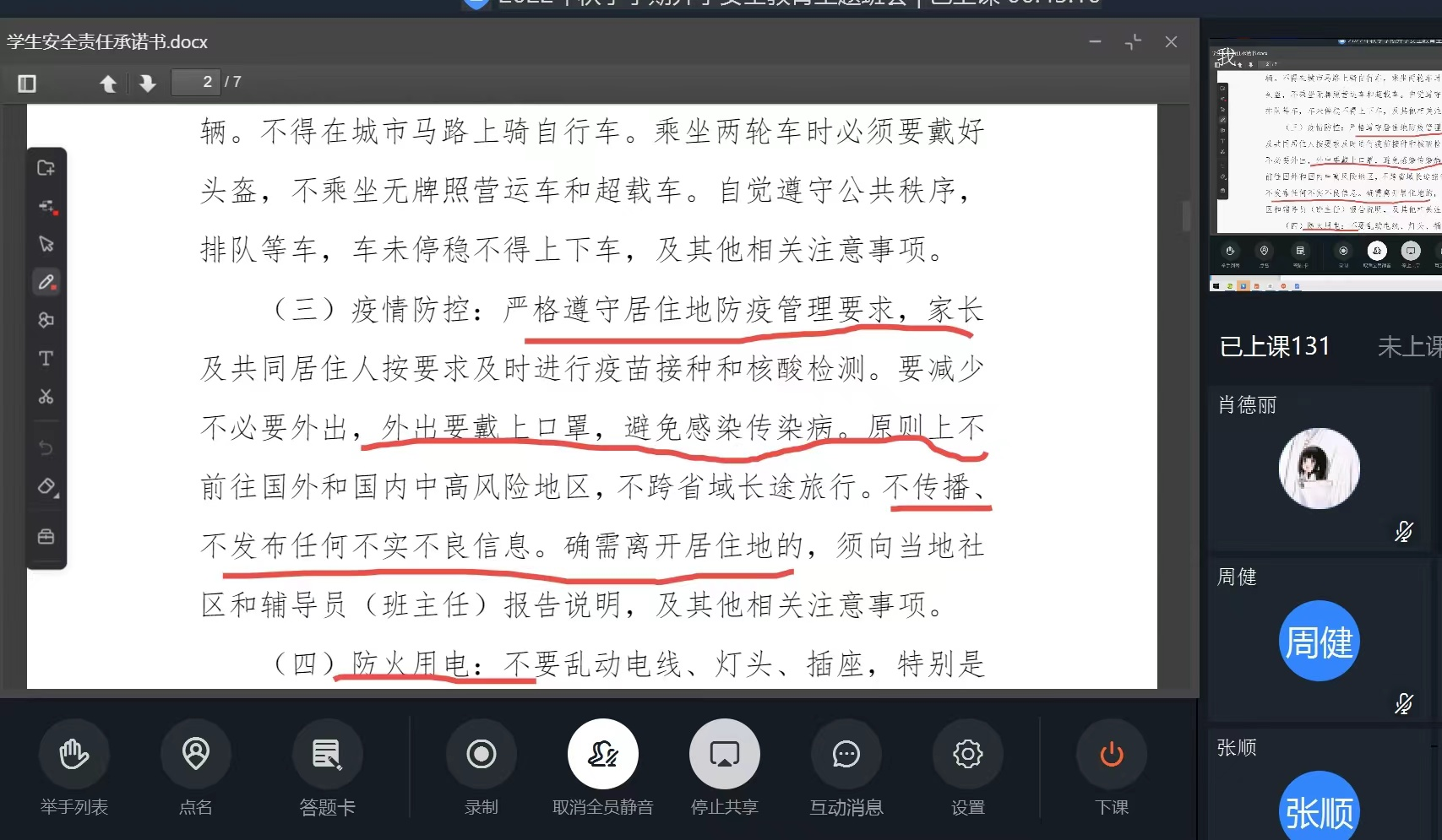 老师们通过网络会议分别从网络安全,校园内外安全,防灾减灾防溺水,人际交往,校规校纪,以及疫情防控多方面、多角度的对新生进行入学教育。老师们用生动具体的事例警示、告诫、教育学生,给每一位学生都留下了深刻的印象,切实上好开学安全教育第一课。迎接新学期的到来,为本学期学生校园生活的安全工作奠定了坚实的基础。