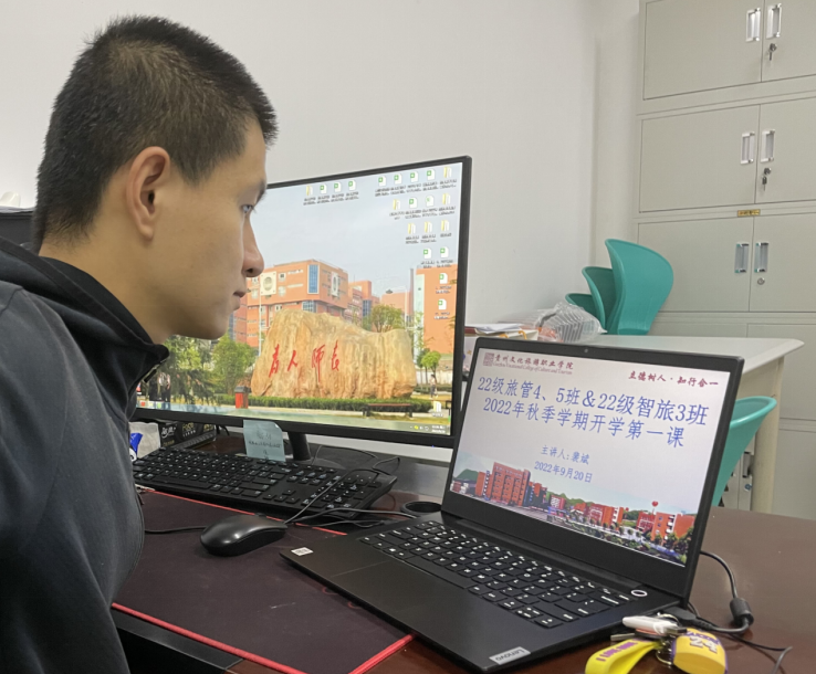 2022年9月20日,旅游管理系2022级辅导员通过钉钉、腾讯会议等在线工具在线上给新生召开了第一场班会——入学安全教育。