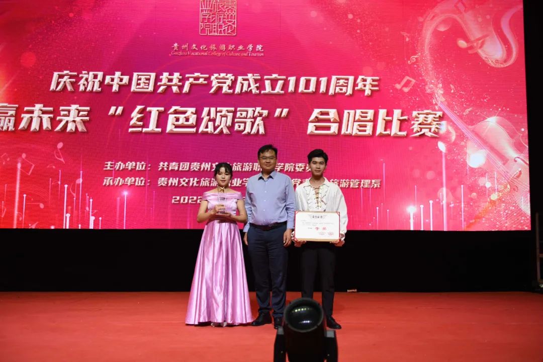 为庆祝中国共产党即将到来的生日,传承和弘扬党的光荣传统和优良作风,6月15日,由共青团贵州文化旅游职业学院委员会主办,第五党支部、旅游管理系承办的“奋进新时代·筑梦新征程”庆祝中国共产党即将到来的生日赢未来“红色颂歌”合唱比赛总决赛在体育馆顺利开展。学院党委书记、院长陆勇昌出席活动并为获奖学生颁奖。