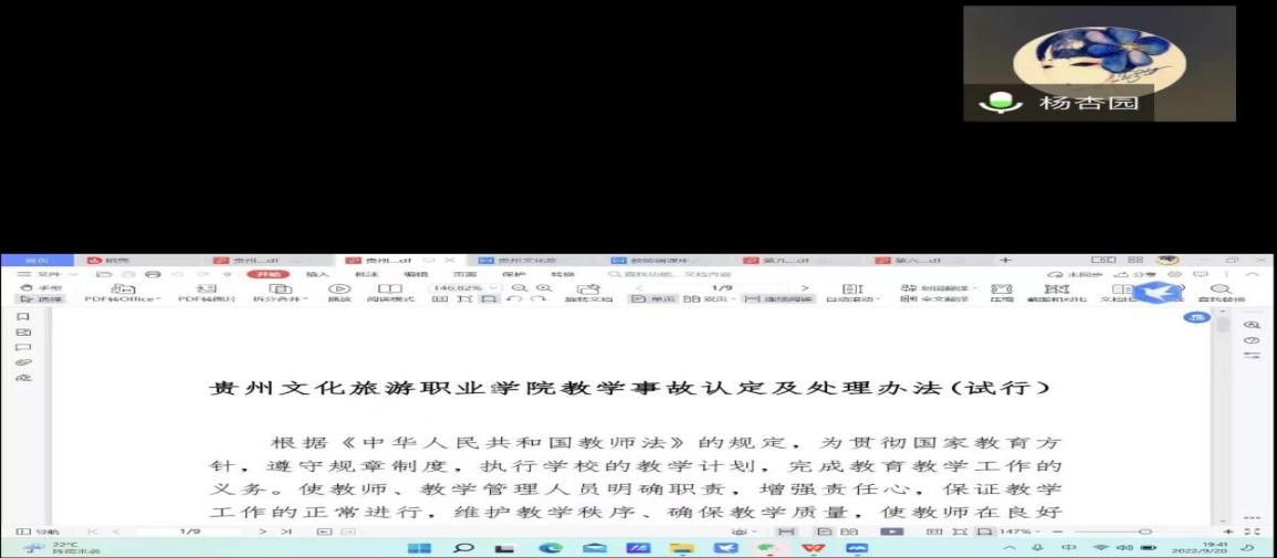 根据贵阳市疫情防控的最新要求,结合我院的实际情况,我院针对不同年级,陆续开展了线上教学活动,目前已开展两周线上教学,整体取得了良好的教学效果。2022年9月20日晚,根据学院教务科工作的安排,部门负责人杨杏园同志组织本部门全体授课教师,通过腾讯会议在线学习了相关文件。系部党政行政工作人员、教务行政工作人员及我部授课教师70余人参与学习。