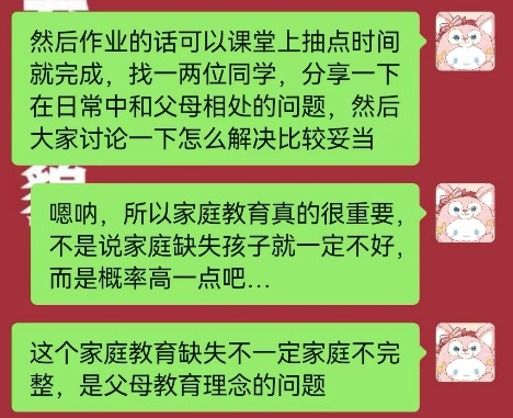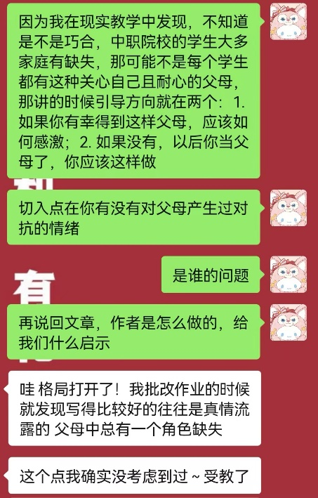 语文的授课过程中,可以模拟情景,把学生带入场景内思考,比如在《合欢树》中,可以设想:假如你遇到和史铁生类似的情况,你会如何面对?尽可能生动地描绘,并且让学生自己设想文中“我”的处境和心态,而不是浅显地想“啊,我的腿断了”。再者关于亲情,做好学情分析,因为在实践中发现部分学生家庭教育有所缺失,有的是单亲家庭,有的是留守儿童,还有的是父母疏于管理,所以不是每一位学生都能对父母的真切关怀动情,可能有的学生和家长关系并不融洽,那就可以以“你有没有对父母产生过对抗情绪?”为切入点,引导学生思考,当关系紧张时,你是怎么想的?你觉得父母是怎么想的?如果以后你成为了父母,你会怎么做?
