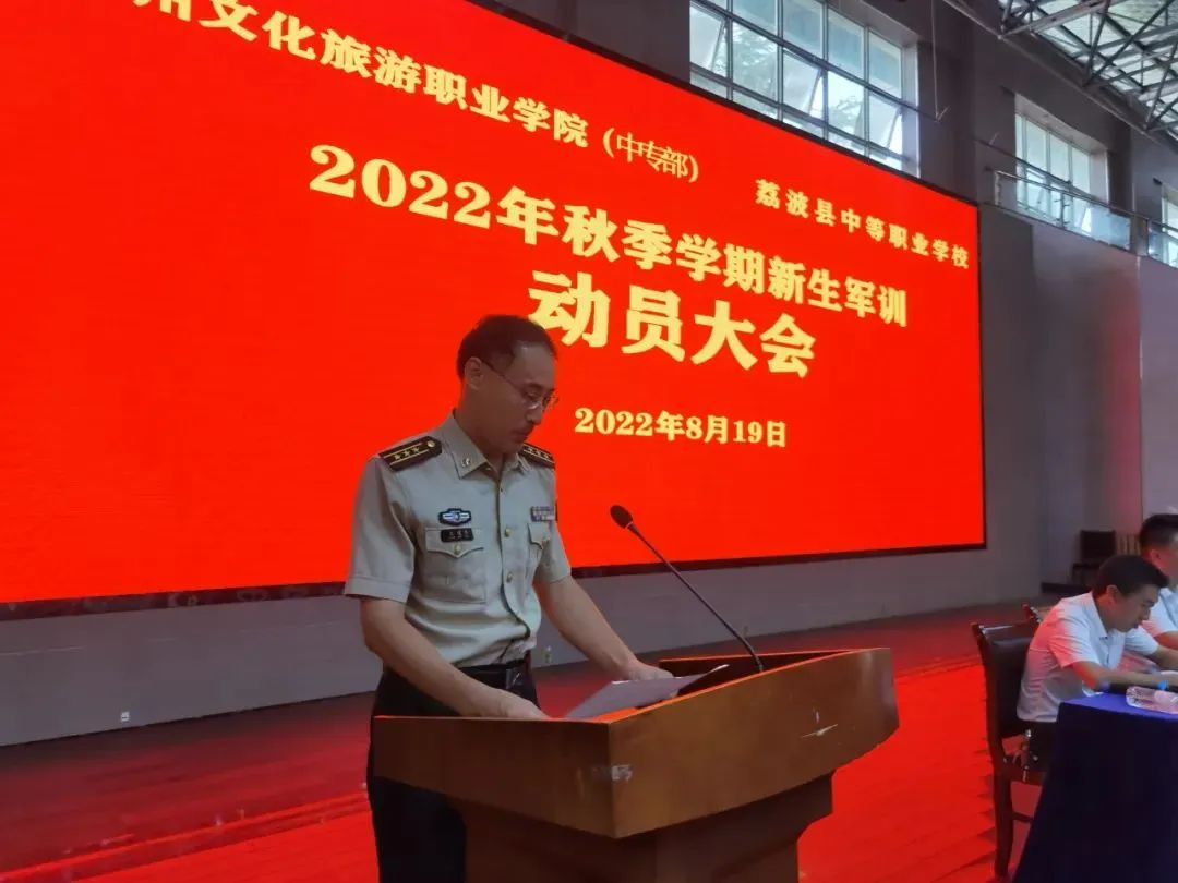 8月19日,贵州文化旅游职业学院(中专部)、荔波县中等职业学校2022新生军训动员大会如期举行。荔波县委常委、县人武部部长王建华,军事科科长麦文庆、贵州省文化旅游学院中专部主任李淘、荔波职校校长任宗禹出席活动。